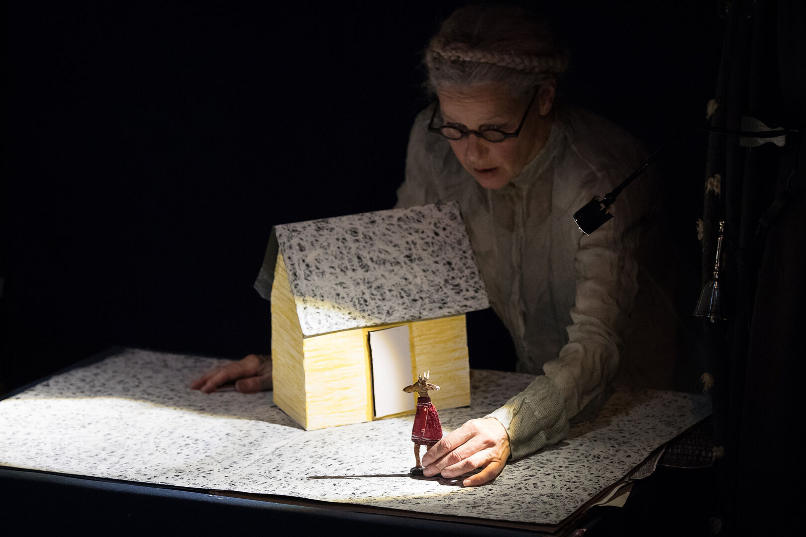Eine kleine Figurentheaterbühne mit einem Häuschen. Eine Schauspielerin hält eine Rentierfigur in der linken Hand. | © Theater Vagabündel, Ute WangeEine kleine Figurentheaterbühne mit einem Häuschen. Eine Schauspielerin hält eine Rentierfigur in der linken Hand. | © Theater Vagabündel, Ute WangeEine Schauspielerin vor schwarzem Hintergrund lässt aus ihrer linken Hand Kunstschnee auf eine kleine Schneelandschaft rieseln | © Theater Vagabündel, Ute WangeEine Schauspielerin vor schwarzem Hintergrund lässt aus ihrer linken Hand Kunstschnee auf eine kleine Schneelandschaft rieseln | © Theater Vagabündel, Ute Wange